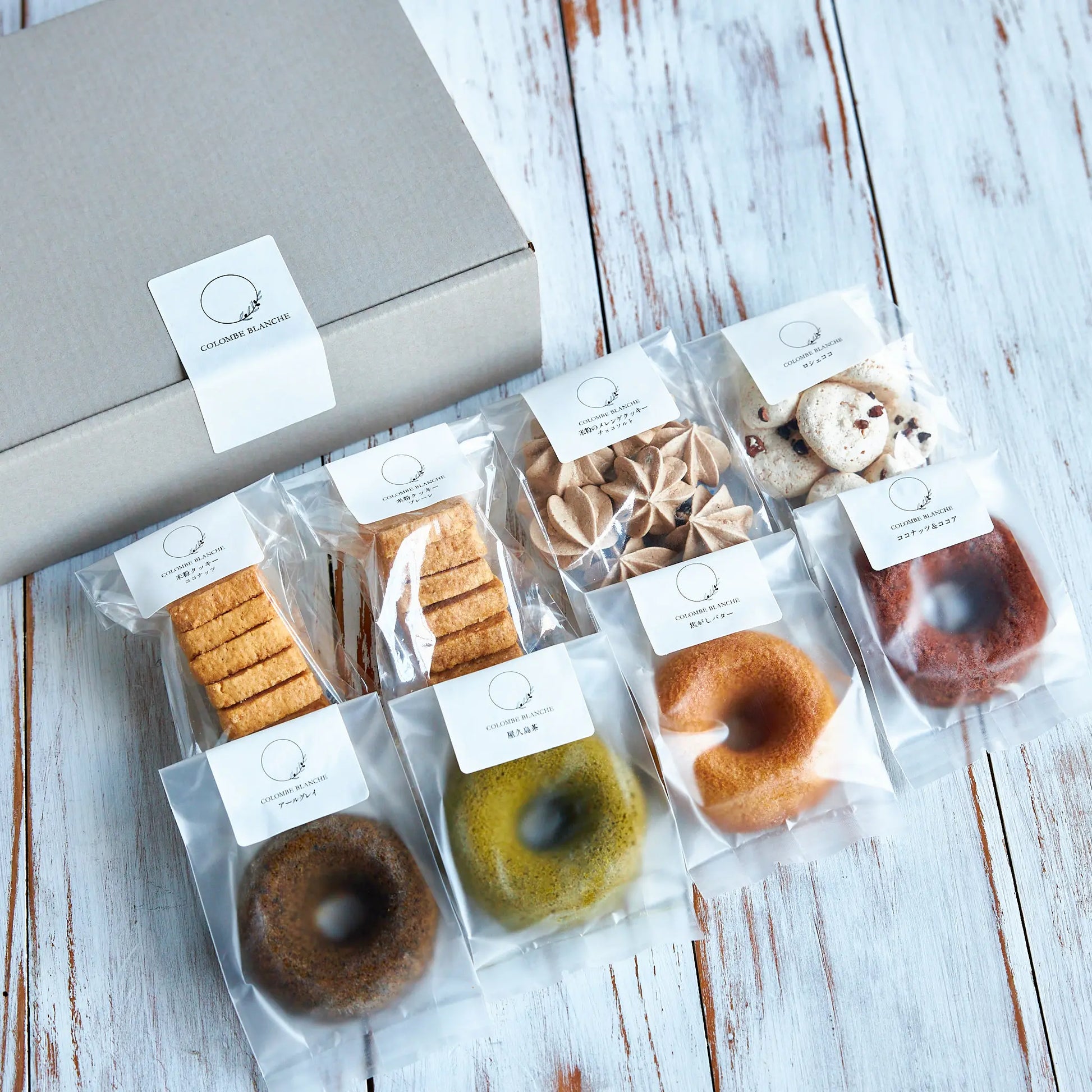 自然栽培の九州産米粉で焼き上げた、からだにやさしいグルテンフリーの焼き菓子ギフトです。焼きドーナツとクッキーを、ちょっとした贈りものにちょうどいい8個セットにしました。